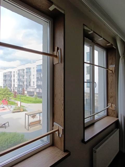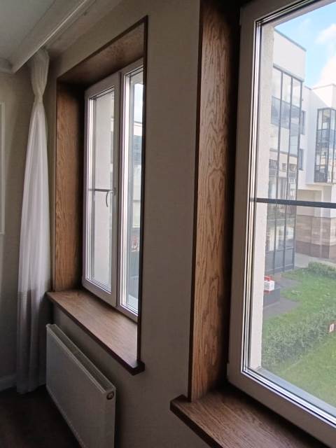 На фото выполненные нашими специалистами работы по отделке оконных откосов деревянными накладками из мдф + шпон дуба. Толщина накладок 11 мм (мдф 10 мм и палуба дуба 1 мм). Покрашено бесцветным маслом.