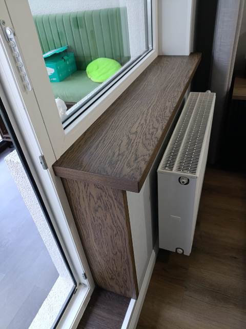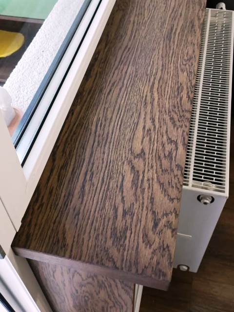Подоконники тоже произведены из влагостойкого ФДФ и покрыты шпоном дуба и спокраской маслом фирмы бормо (Италия). Толщина подоконника, согласно технического задания и дизайн проекта 28 мм.