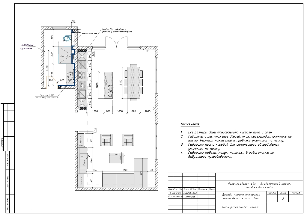 Ведомость чертежей; Обмерочный план; План растановки мебели; Планы монтажа полов и потолков; Схемы розеток, светильников и выключателей для гостиной, санузла, спальных комнат, кухни, коридора и холла; Развертки по стенам помещений санула, столовой и гостиной комнаты; Ведомость отделки помещений; Спецификация мебели, светильников и сантехники на 4 листах.